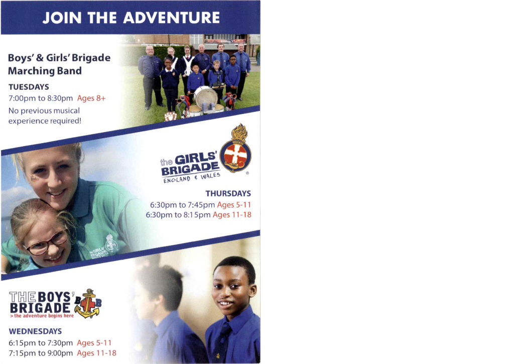 The Brigades Marching Band is a joint band with members of the 1st Loughborough Girls’ Brigade and meets for band practice on Tuesday evenings from 19:00 to 20:30.
